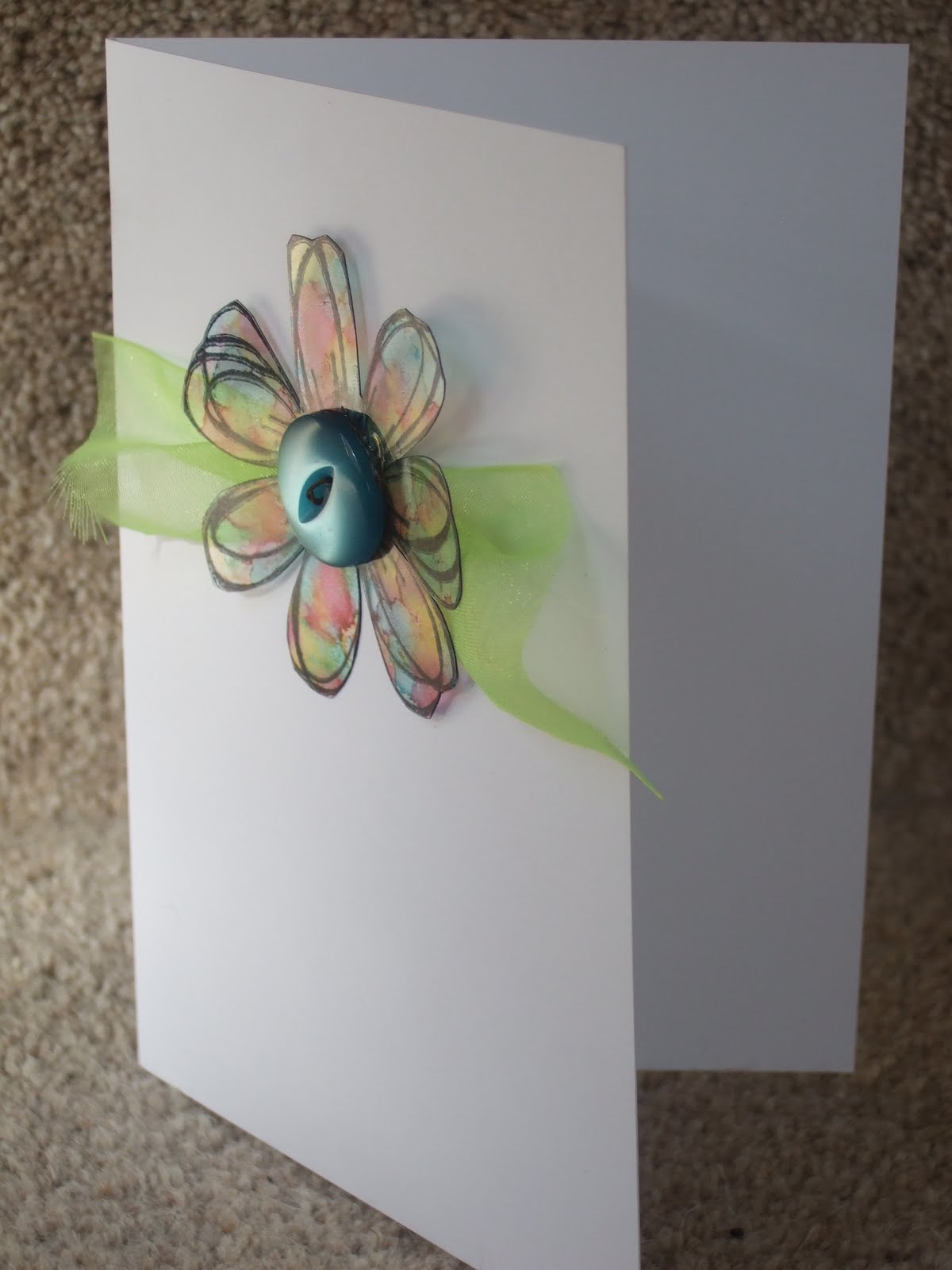 To make this card I stamped Carol's flower from Stampotique onto acetate with stazon, then on the reverse I applied various colours of ranger alcohol inks with a blending tool. I then glued this to the card, to which I had already added a ribbon (by threading through the card), glued on a button.